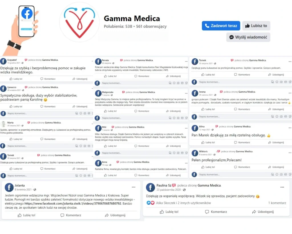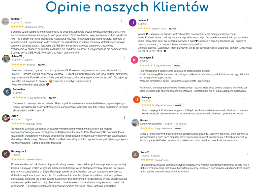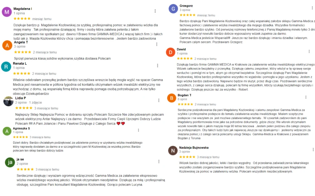 Opublikowano na HarleyTrustindex sprawdza, czy pierwotnym źródłem recenzji jest Google. Coś wspaniałego i w dzisiejszych czasach aż niemożliwego a jednak...ogłoszenie o darmowych wózkach dla mnie oznaczało "bądź ostrożna". Telefon od pani Edyty Rabiej rozwiał moje wątpliwości w 99% ale gdy przyszło kolejne potwierdzenie o przygotowaniu wózka do wysyłki, mało nie spadłam z krzesła! 8 dni i Tata po udarze oraz przy RZS ma swój własny wózek inwalidzki o podwyższonym komforcie użytkowania:) Szczere DZIĘKUJĘ! To wydarzyło się naprawdę. Koszt wózka 4000 zł całkowicie dofinansowany z NFZ:)Opublikowano na Jarosław MaTrustindex sprawdza, czy pierwotnym źródłem recenzji jest Google. Uzyskanie sprzętu z refundacją dla osoby potrzebującej, profesjonalnie, szybko i z empatią do osoby. Dziękuję bardzo i polecam Panią JolantęOpublikowano na Hanna DettlaffTrustindex sprawdza, czy pierwotnym źródłem recenzji jest Google. Świetna obsługa. Szybko przesłany wózek bez jakichkolwiek kosztów. Dziękuję bardzo i polecam innym potrzebującym.Opublikowano na Barbara WiśniewskaTrustindex sprawdza, czy pierwotnym źródłem recenzji jest Google. Dzień dobry, bardzo dziękuję za szybkie dostarczenie wózka mojej mamie, za profesjonalne podejście do pacjenta, cała procedura łącznie z dostawą wózka trwała 7 dni. Bardzo dziękuję Pani Magdalenie Kozłowskiej , która wszystko dokładnie wytłumaczyła i pokierowała, jeszcze raz dziękuję i polecam .Z poważaniem Barbara WiśniewskaOpublikowano na Krzysztof KruzaTrustindex sprawdza, czy pierwotnym źródłem recenzji jest Google. Polecam serdecznie! wózek został dostarczony bardzo szybko a cała aplikacja jest bardzo łatwa i szybka. Bez problemowo i elegancko polecam serdecznie!Opublikowano na Aleksandra KulczyńskaTrustindex sprawdza, czy pierwotnym źródłem recenzji jest Google. Bardzo polecam tą firmę . Załatwienie spraw i dostarczenie wózka trwało zaledwie 5 dni . Jednak są ludzie którzy naprawdę pomagają ♥️ bardzo dziękujemyOpublikowano na I ZTrustindex sprawdza, czy pierwotnym źródłem recenzji jest Google. Z największą przyjemnością podzielę się opinią o firmie Gamma Medica i pani konsultantce Magdalenie Kozłowskiej, ktòra z wielką cierpliwością i fachowością wyjaśniła procedurę otrzymania wózka inwalidzkiego z refundacją NFZ. Ta wiedza pozwoliła mi bez kłopotów i wątpliwości krok po kroku sprawnie załatwić sprawę. Firma zgodnie z przekazaną informacją w ciągu tygodnia dostarczyła wózek spełniający wszelkie oczekiwania. Firma godna polecenia.Opublikowano na Rajnhard NalikTrustindex sprawdza, czy pierwotnym źródłem recenzji jest Google. od pierwszego telefonu z panią Magdaleną Kozłowską do otrzymania wózka upłynęło zaledwie siedem dni. Nie wierzyłem że można całkowicie za darmo otrzymać wózek inwalidzki i to w dzisiejszym czasie. Wózek jest potrzebny aby teściowa mogła miło spędzać czas na wolnym powietrzu w ciekawych miejscach. Całemu personelowi a w szczególności pani Magdalenie Kozłowskiej życzę dużo zdrowia, pomyślnościOpublikowano na Ewelina KubiśTrustindex sprawdza, czy pierwotnym źródłem recenzji jest Google. Polecam w 100%. 28 czerwca po raz pierwszy skontaktowałam się z Panią Magdalena Kozłowską, która to szczegółowo wszystko wytłumaczyła jak to zrobić, by teściowa dostała wózek z refundacji. Papiery wysłane wieczorem, rano już konsultacja z lekarzem, a w poniedziałek 03.07.23 wózek już był u nas. Wózek solidny wygodny nowy i całkiem za darmo. Jeszcze raz polecam i serdecznie dziękuję Pani Magdalenie za pomocOpublikowano na Андрей ЮжаковTrustindex sprawdza, czy pierwotnym źródłem recenzji jest Google. Очень благодарен Gamma Medica! Помогли получить инвалидную коляску для моей мамы. Все очень просто и быстро. Рекомендую!!!
